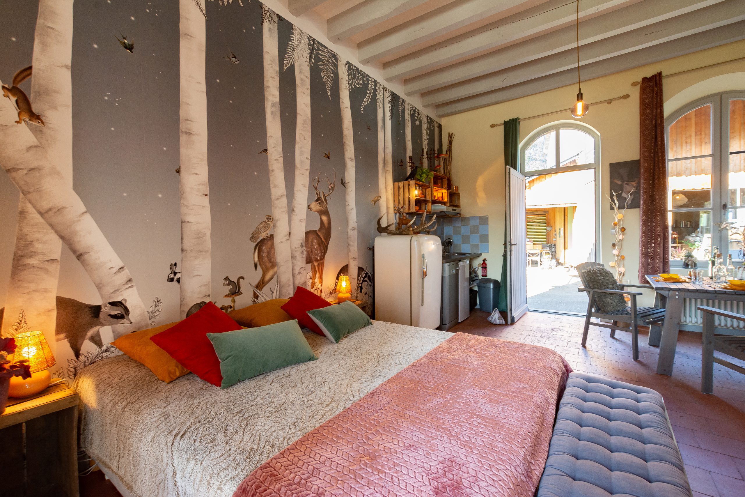 L’atmosphère cosy et feutrée de cet espace où cerfs et chevreuils peuvent pointer leur nez en lisière de forêt, en fait un hébergement absolument singulier.