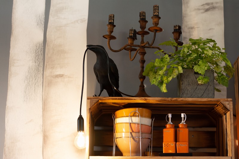 - kitchenette toute équipée et coin repas au milieu d’une pièce qui sent bon la forêt